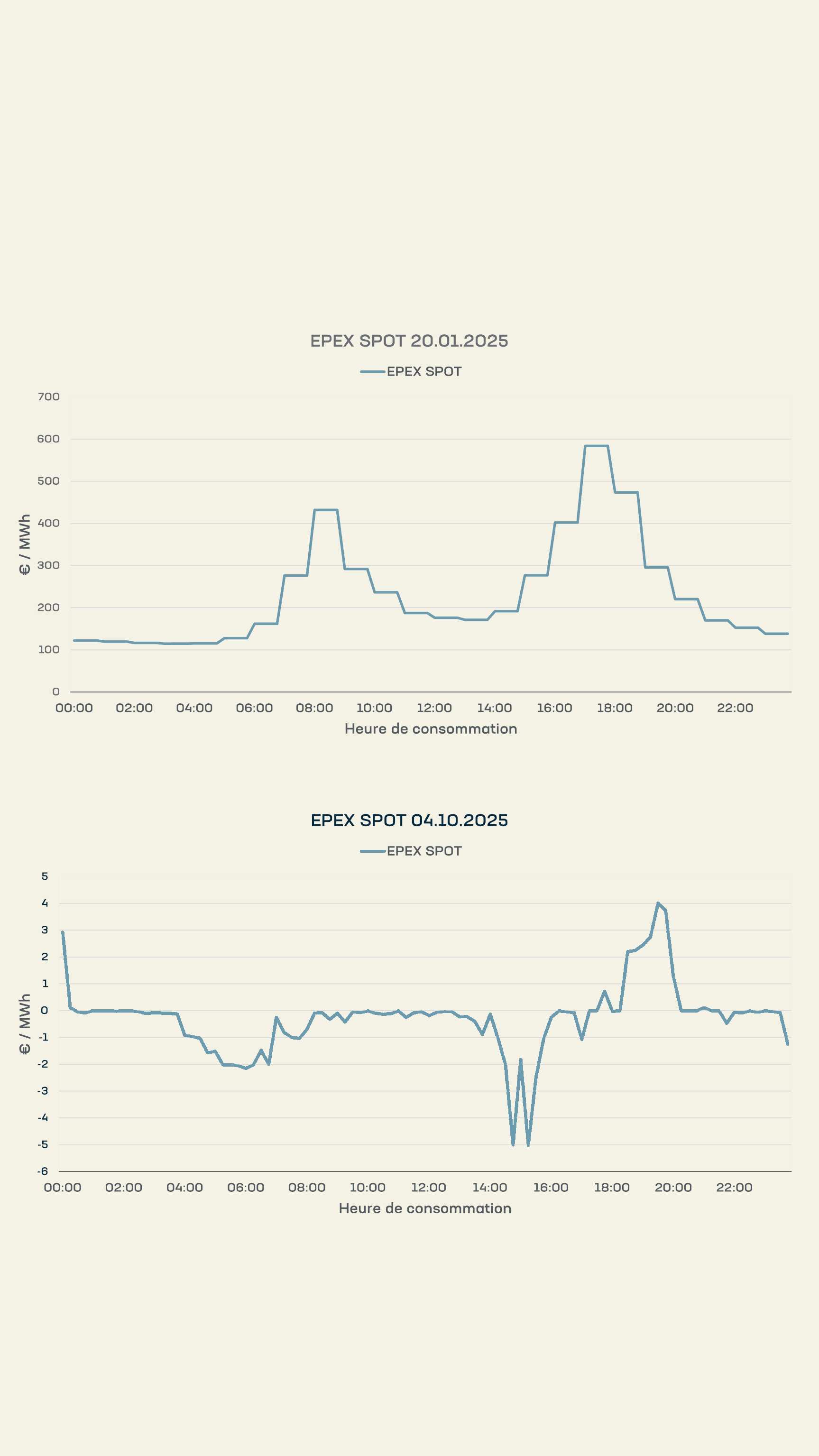 Voici deux exemples qui illustrent l'ampleur de ces variations. À noter : Ces deux journées montrent volontairement des situations de prix très extrêmes. Il s’agit de cas réels, mais purement illustratifs, qui ne représentent ni l’évolution générale des prix en 2025, ni les prix futurs.